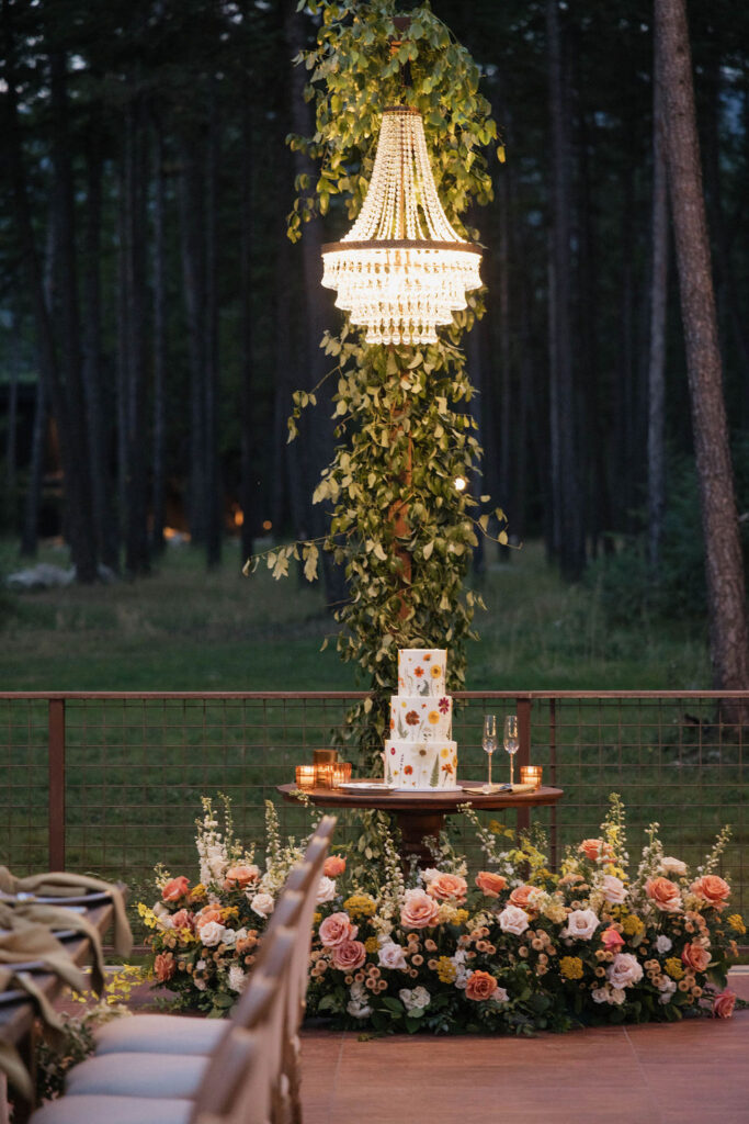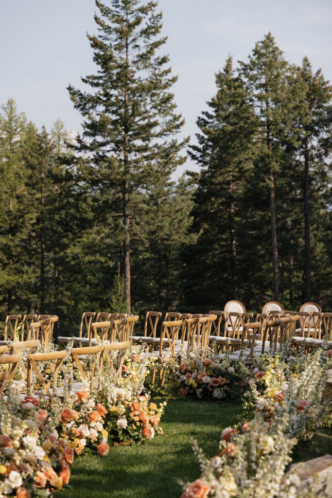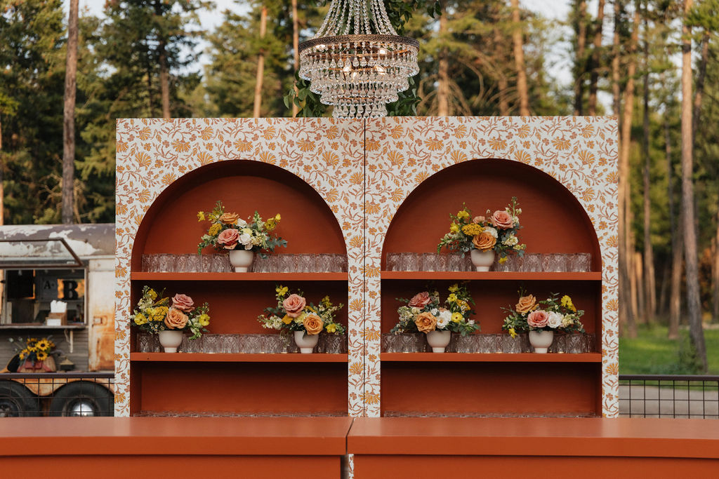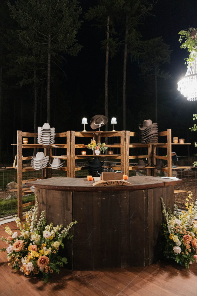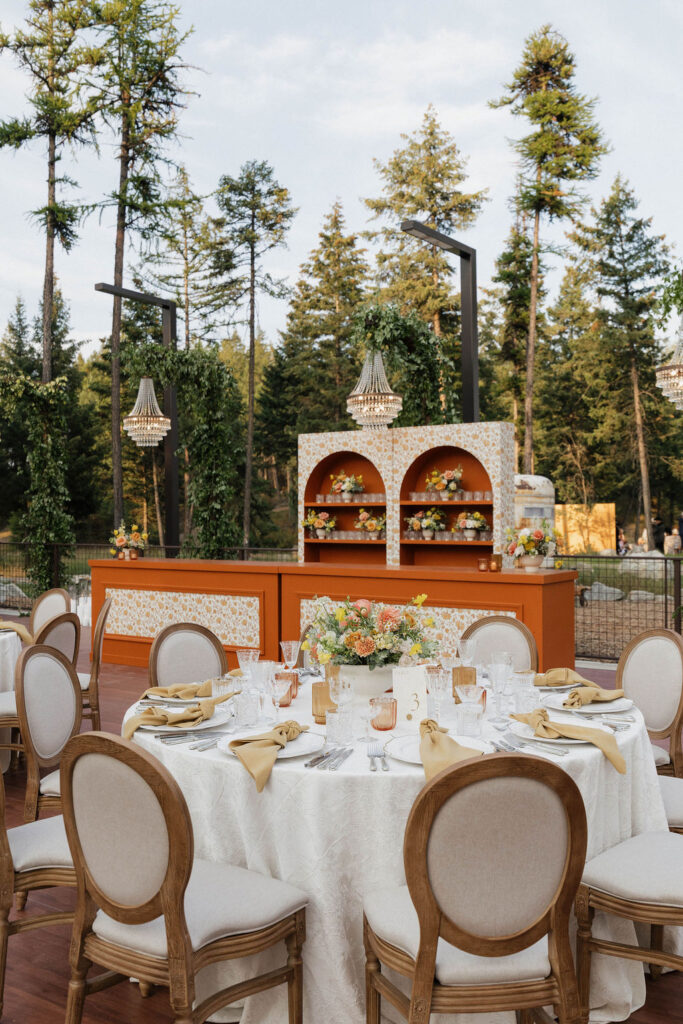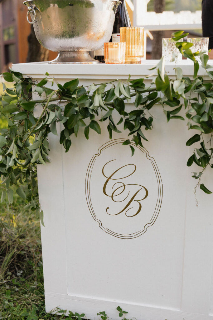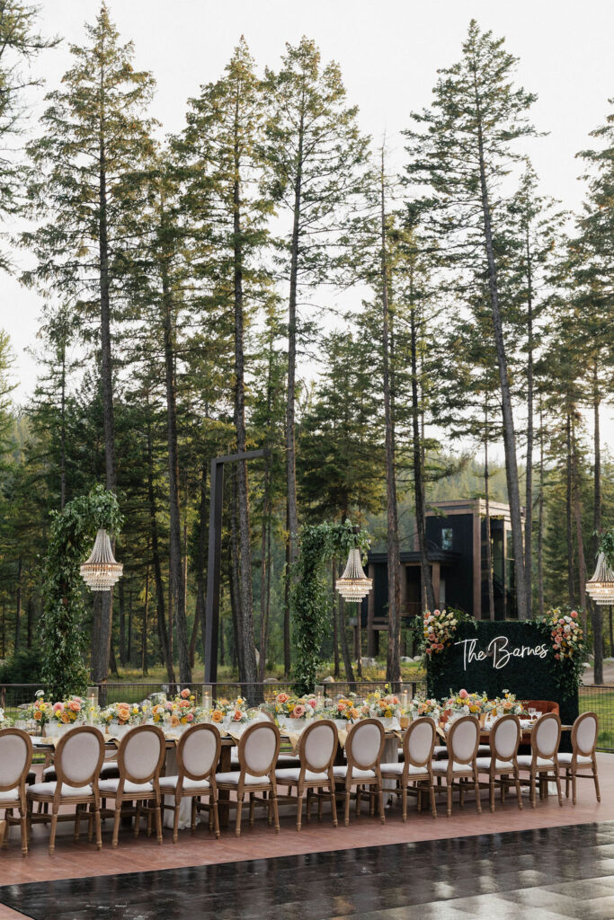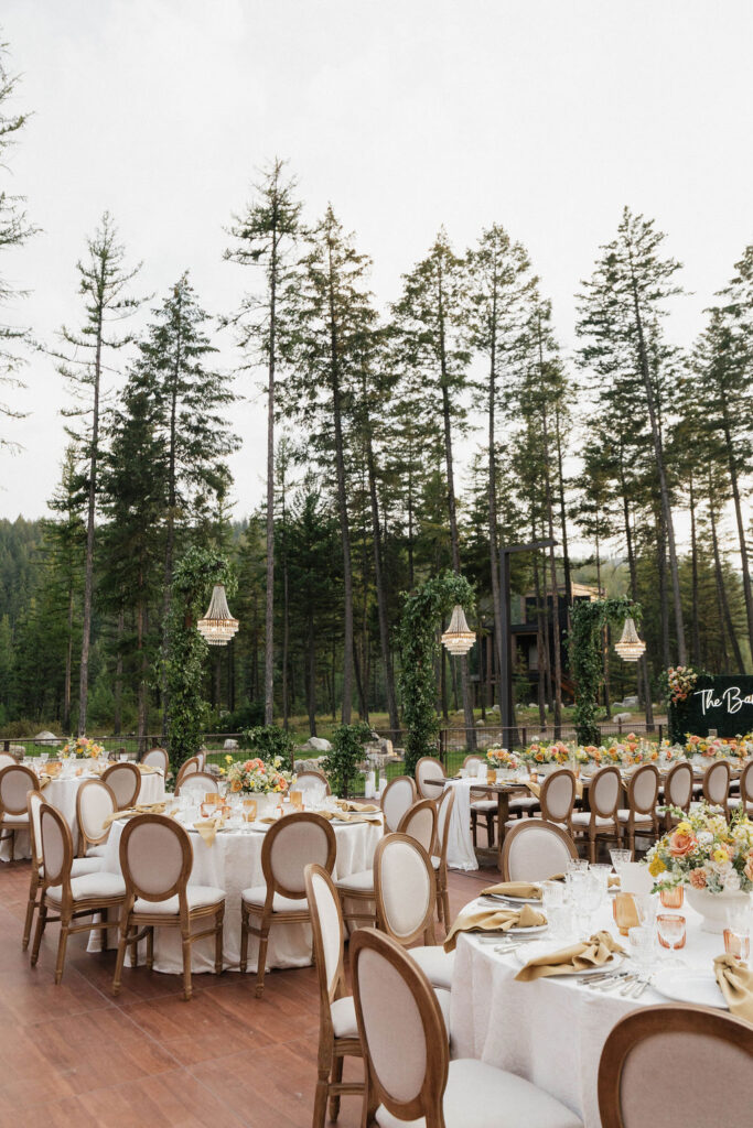 These photos speak for themselves, capturing the beauty of Montana in the most effortless way. Transforming this private estate was no small feat, but our team worked tirelessly behind the scenes and on the wedding day to bring the bride’s vision to life. From custom wallpaper woven throughout the design—featured on the seating chart and carried through to the reception bar—to camouflaging the sports court where the reception took place, every inch of the space was thoughtfully curated. Personalized journals doubled as escort cards and meaningful keepsakes for guests, while the statement bar shimmered beneath cascading chandeliers, anchoring the space with refined elegance. Planned with intention and an eye for finer details, this day left guests in awe of both the setting and the celebration itself.
