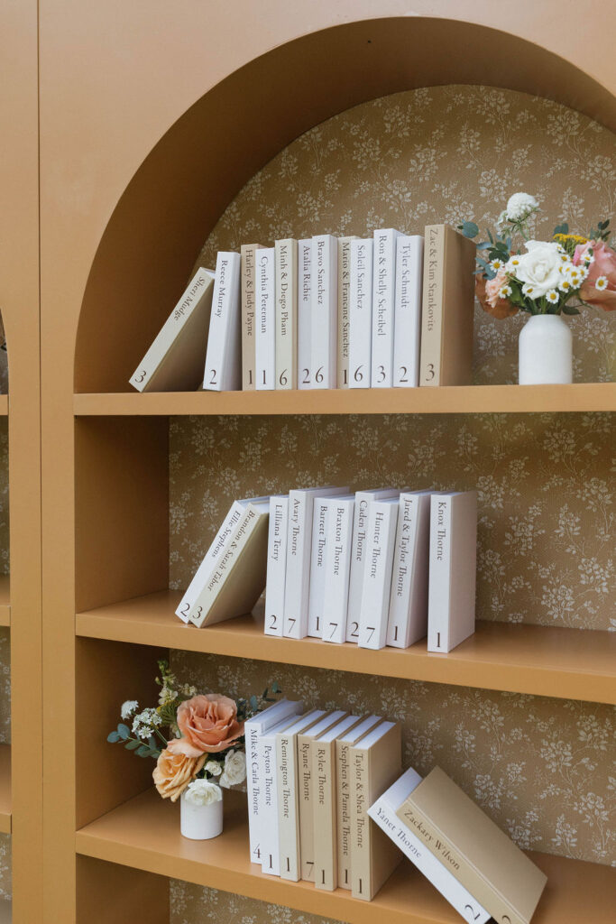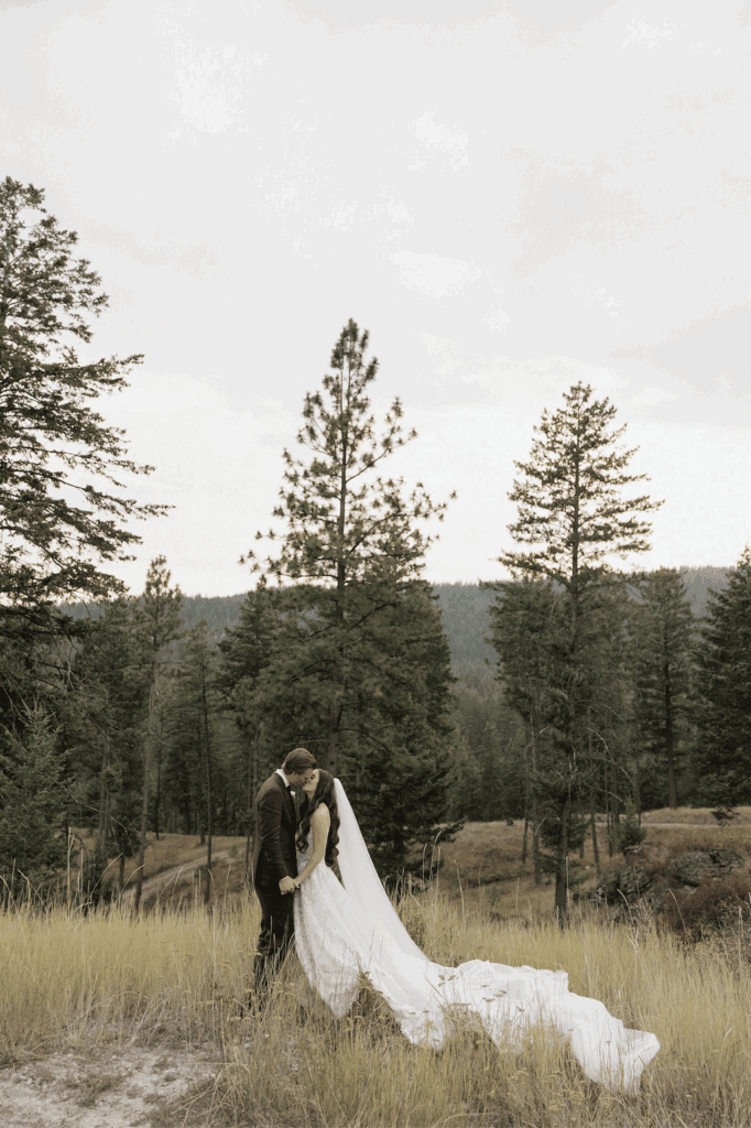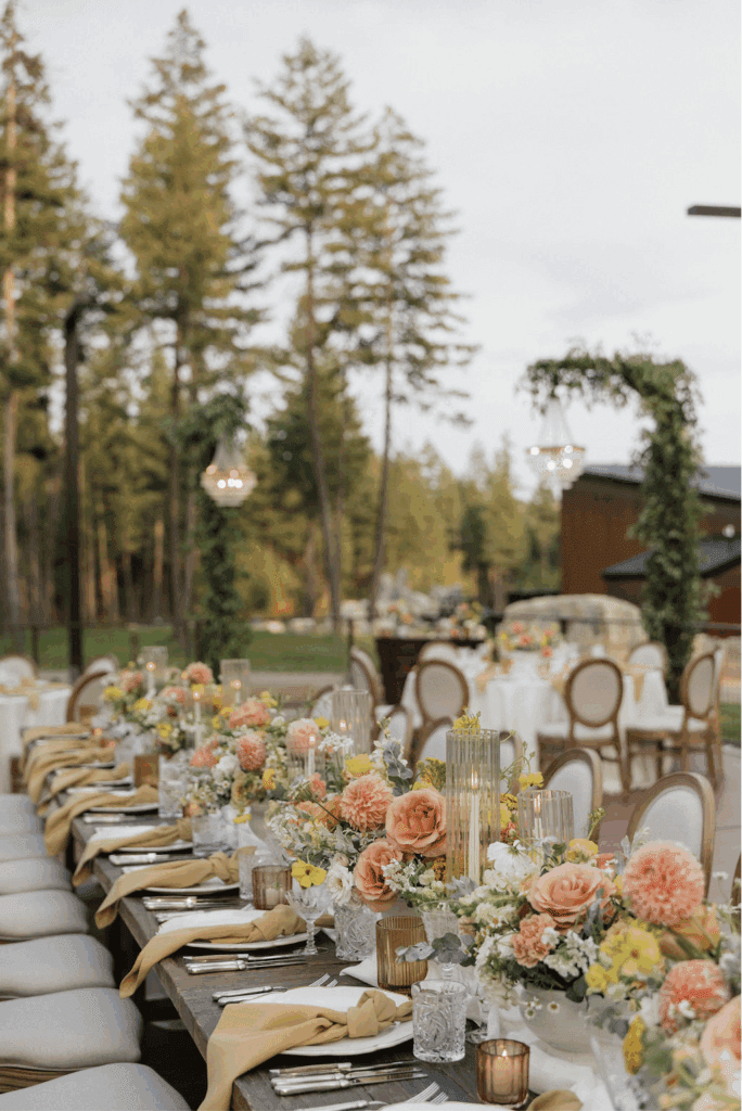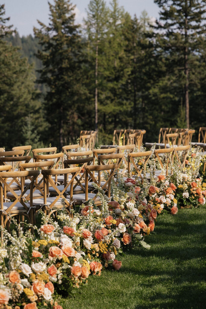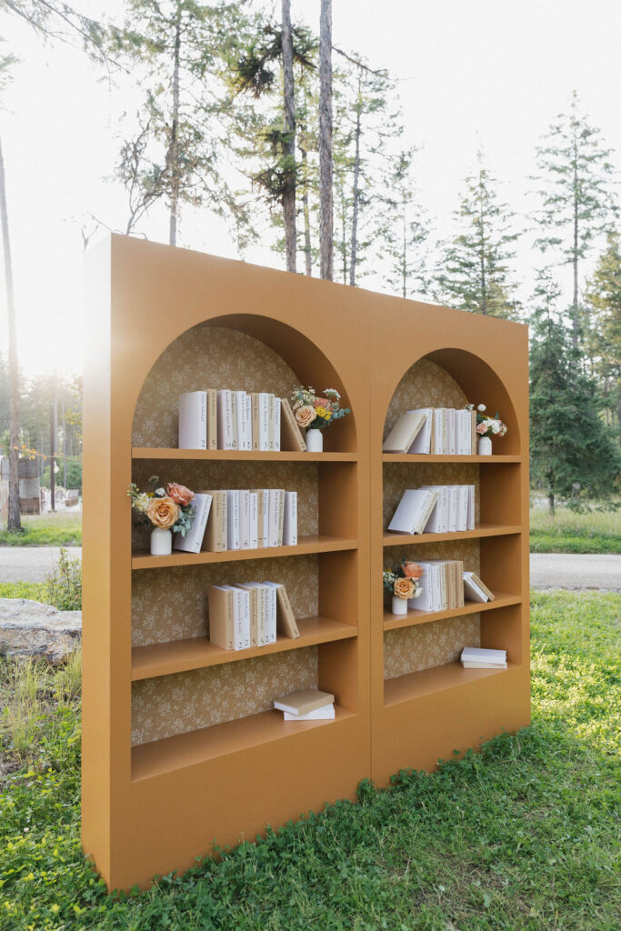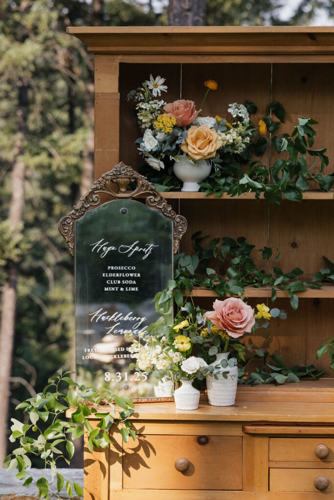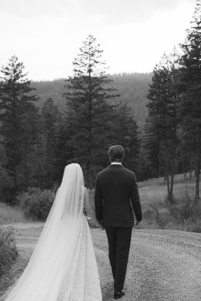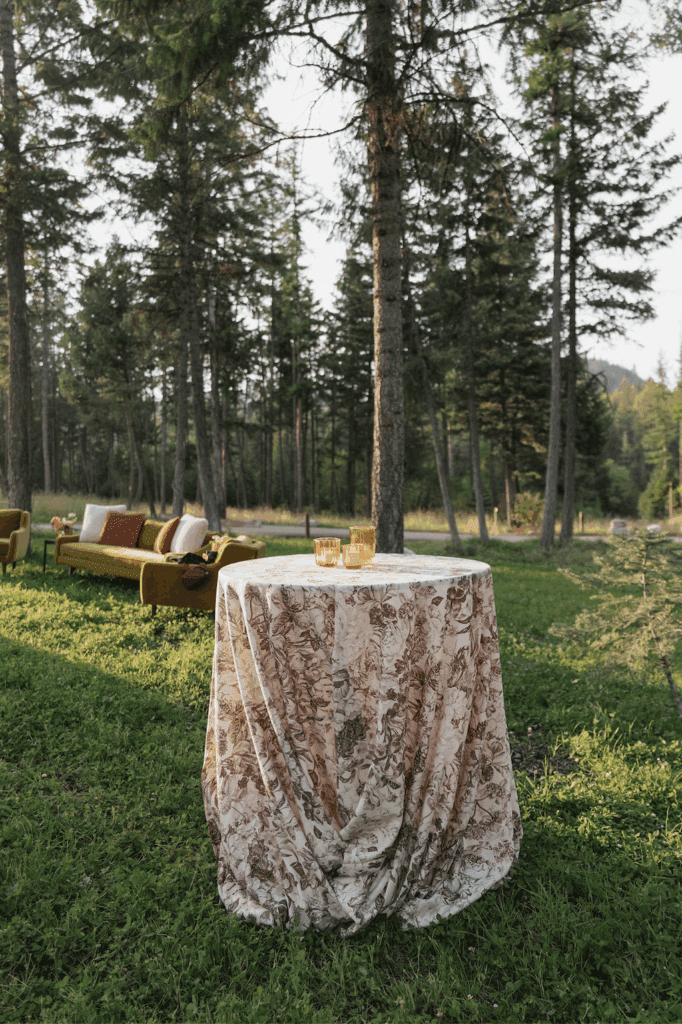 These photos speak for themselves, capturing the beauty of Montana in the most effortless way. Transforming this private estate was no small feat, but our team worked tirelessly behind the scenes and on the wedding day to bring the bride’s vision to life. From custom wallpaper woven throughout the design—featured on the seating chart and carried through to the reception bar—to camouflaging the sports court where the reception took place, every inch of the space was thoughtfully curated. Personalized journals doubled as escort cards and meaningful keepsakes for guests, while the statement bar shimmered beneath cascading chandeliers, anchoring the space with refined elegance. Planned with intention and an eye for finer details, this day left guests in awe of both the setting and the celebration itself.