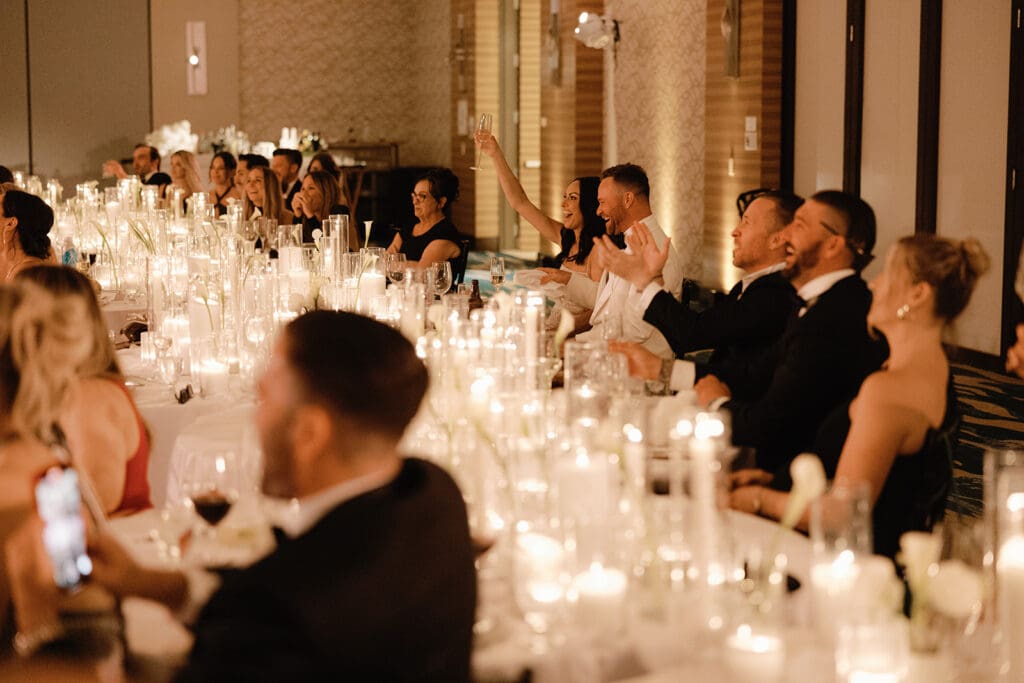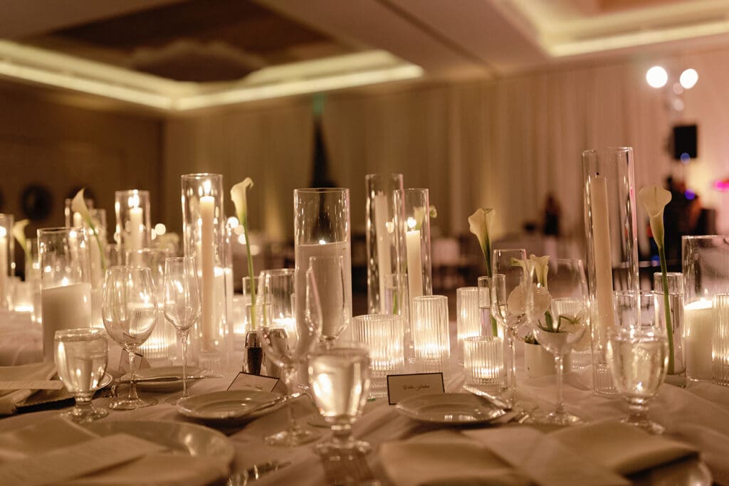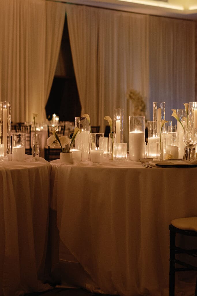 As the sun set, the reception came to life with glowing candles, glass accents, and elegant touches of calla lilies. The entire evening felt warm, romantic, and effortlessly beautiful, a true reflection of the couple’s chic and coastal style.