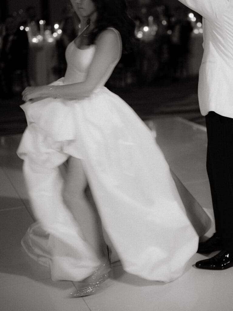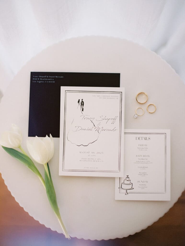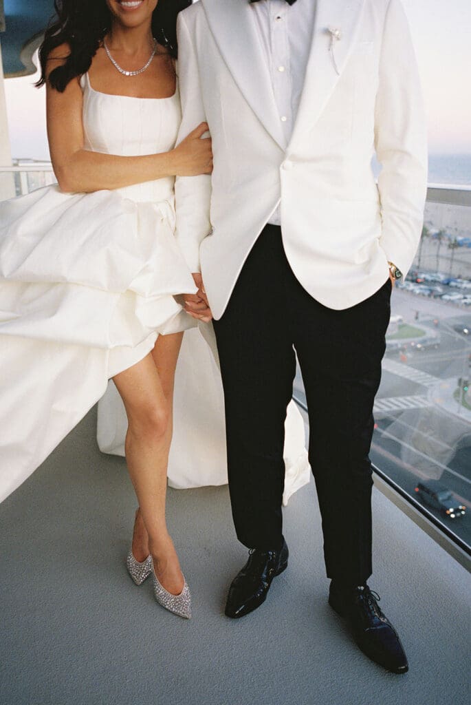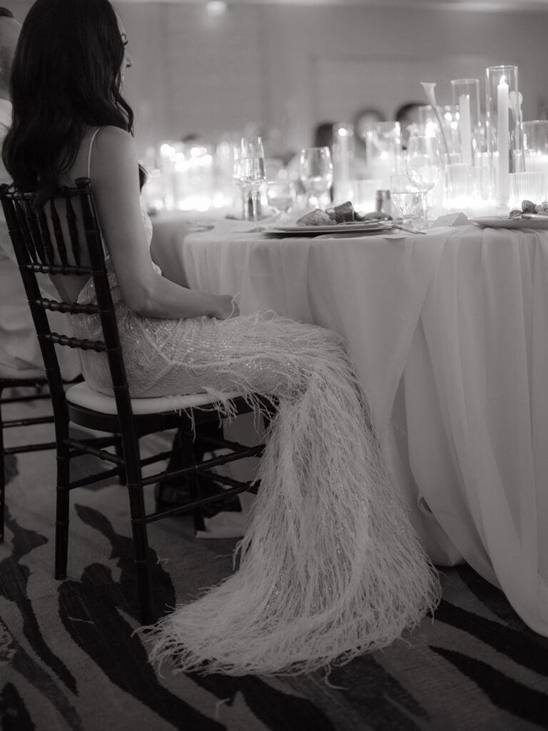 As a stylist, Tracy brought her impeccable eye for fashion to every part of the day, wearing three stunning dresses throughout the celebration. She began the day in a breathtaking Dana Harel gown that perfectly captured her sophisticated bridal style. For the reception, she changed into a playful feather dress by Retrofête, adding a touch of glamour to the evening. To end the night, she slipped into a chic mini dress from Leau, all beautifully curated from NWLA Bridal.